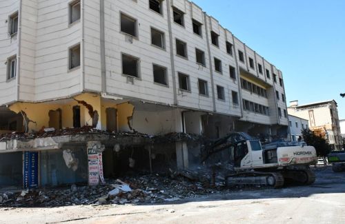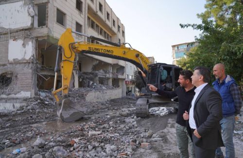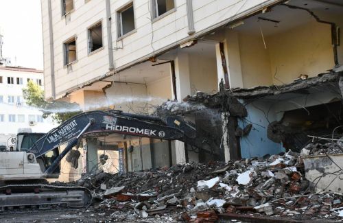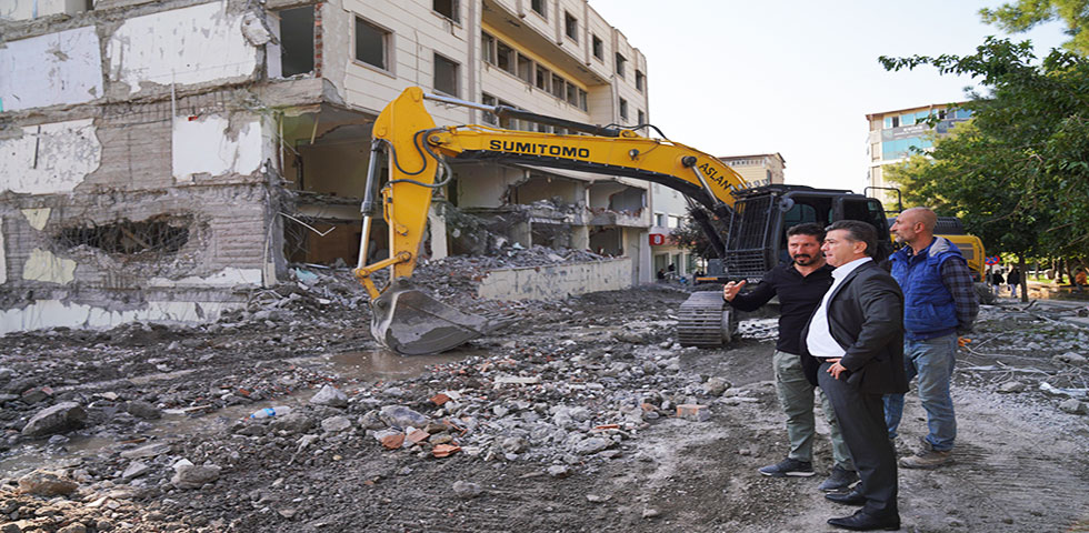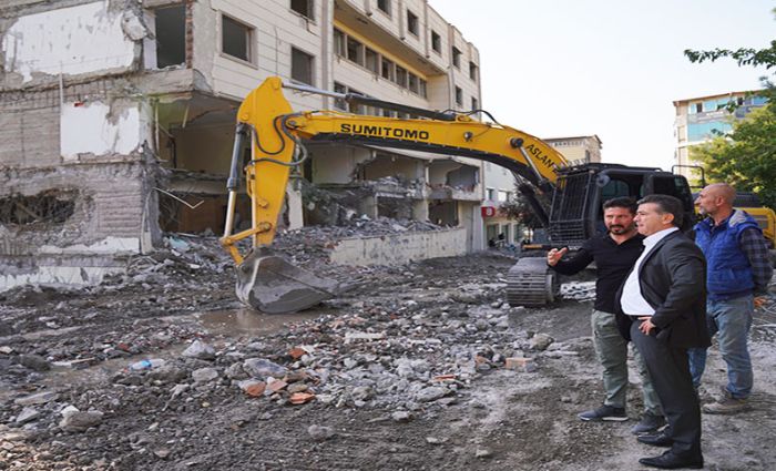 6 Şubat depreminde ağır hasar alarak boşaltılan Belediye hizmet binasının yıkım çalışmaları devam ederken vatandaşlar çalışmalardan dolayı Belediye Başkanı Ali Murat Bucak'a teşekkür etti.