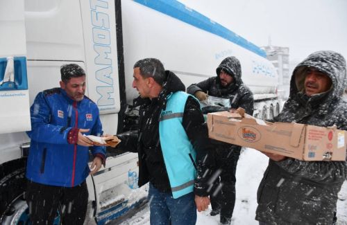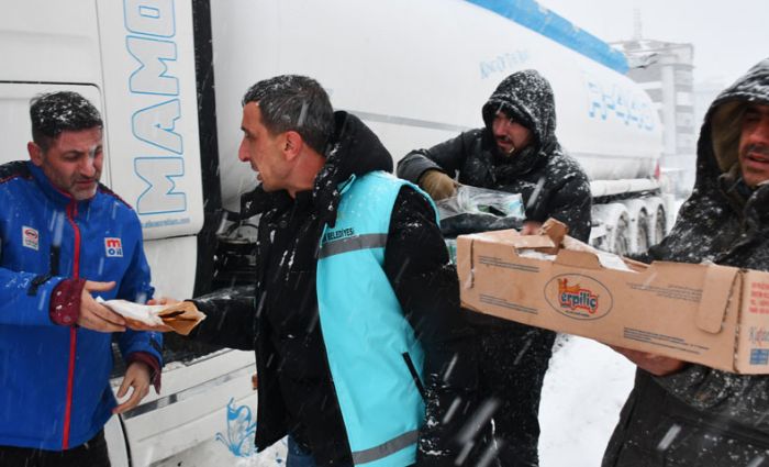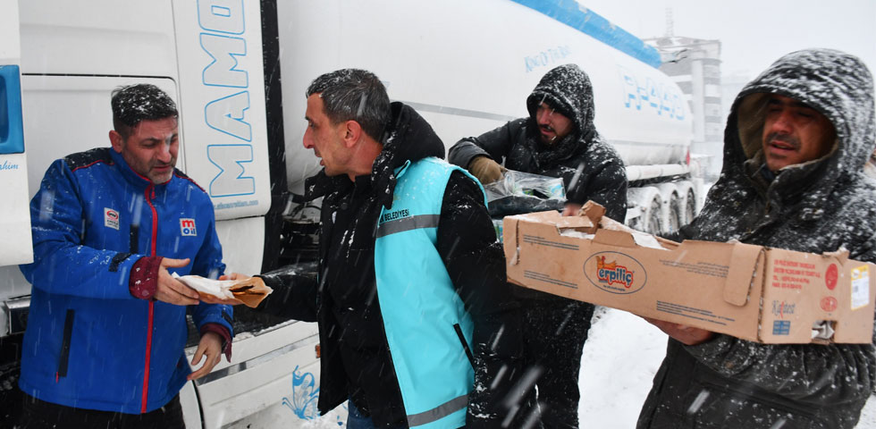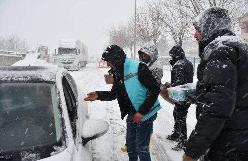 Ekipler, ilçe merkezi ve karayollarında mahsur kalan sürücüleri tek tek ziyaret ederek çorba ve lahmacun ikramında bulundu.