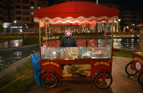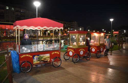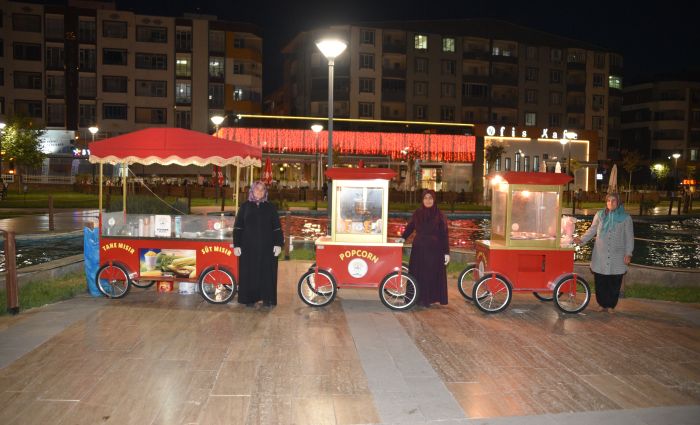 Bu kadınlar, akşam saatlerinde ziyaretçi akınına uğrayan parkta belediye tarafından tahsis edilen araçlarda süt mısır, patlamış mısır, pamuk şeker ve cici bici gibi ürünler satıyor.