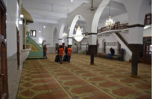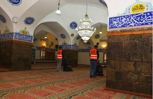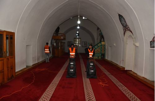 Çalışmalar çerçevesinde cami içi genel temizlik ile halıların yıkanması ve tozdan arındırılması işlemleri gerçekleştiriliyor.