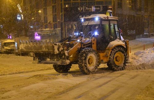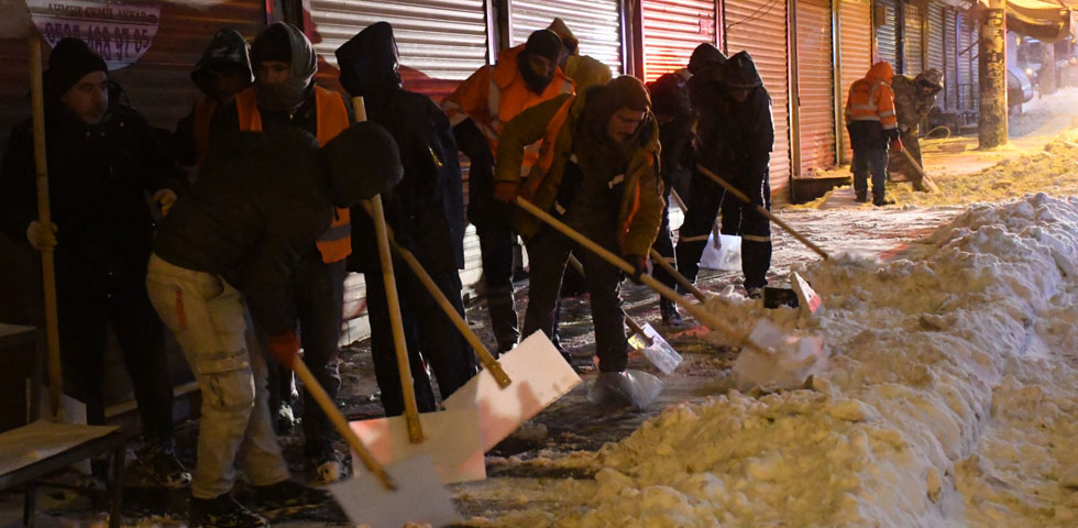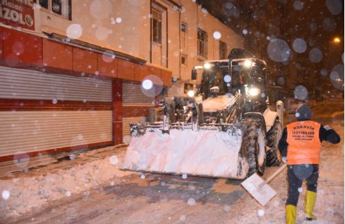 Eş zamanlı olarak caddelerde küreme çalışmalarına devam eden belediye ekipleri, mesai mefhumu gözetmeden çalışmalarını sürdürüyor.