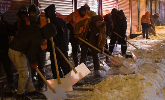 Saat 21.00 sıralarında Ağaçhan Parkı’nda bir araya gelen ekipler, ilçe genelinde ana caddelerde ve kaldırımlarda biriken karları temizledi.