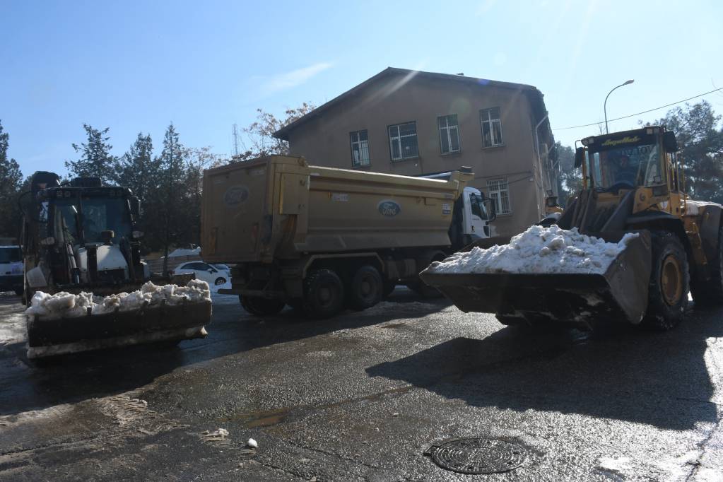 Belediyemize Bağlı ekipler, iş makineleriyle ana arterlerde biriken kar kütlelerini kamyonlarla şehir dışına taşıyarak tuzlama çalışmalarını sürdürüyor.