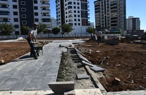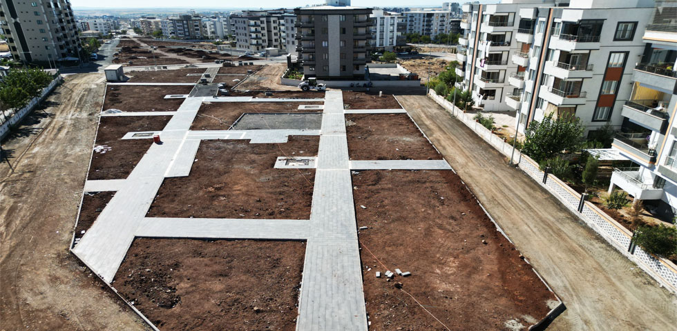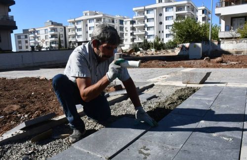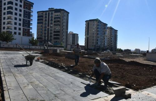 Yeşil alan olarak belirlenen 50 dönümlük geniş arazide 16 bölümden oluşan parklarda bazalt taşı ve bordür döşeniyor.