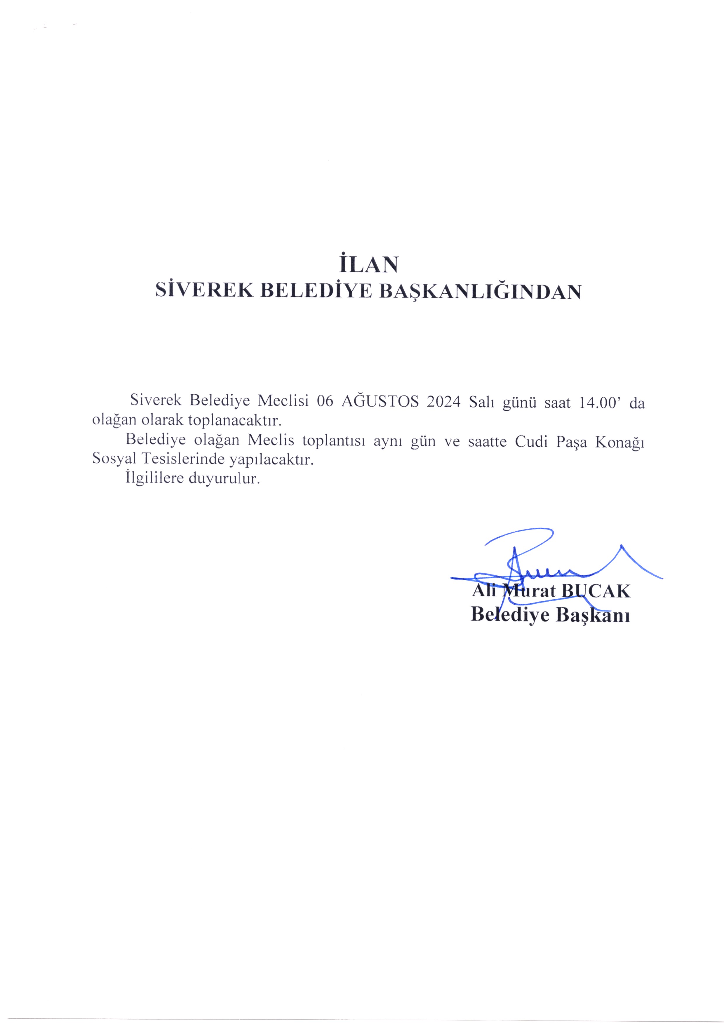 Ağustos Ayı Belediye Meclis Toplantı İlanı