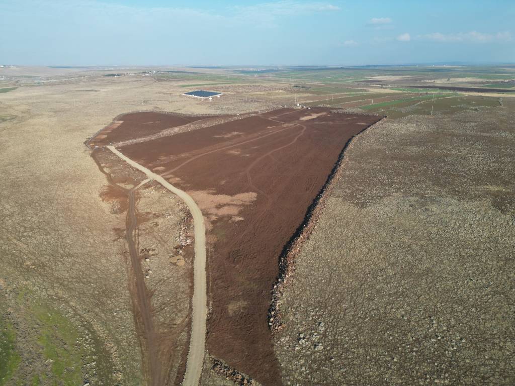 Yoğunca Mahallesi yakınlarında 170 dönümlük arazide taş temizleme ve çevre düzenleme çalışmalarının tamamlandığı proje alanında, 100 dönüme şire üzümü fideleri, 70 dönümlük alana ise çeşitli meyve ağaçları dikilecek.
