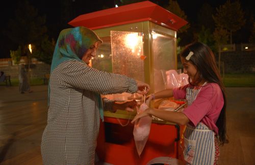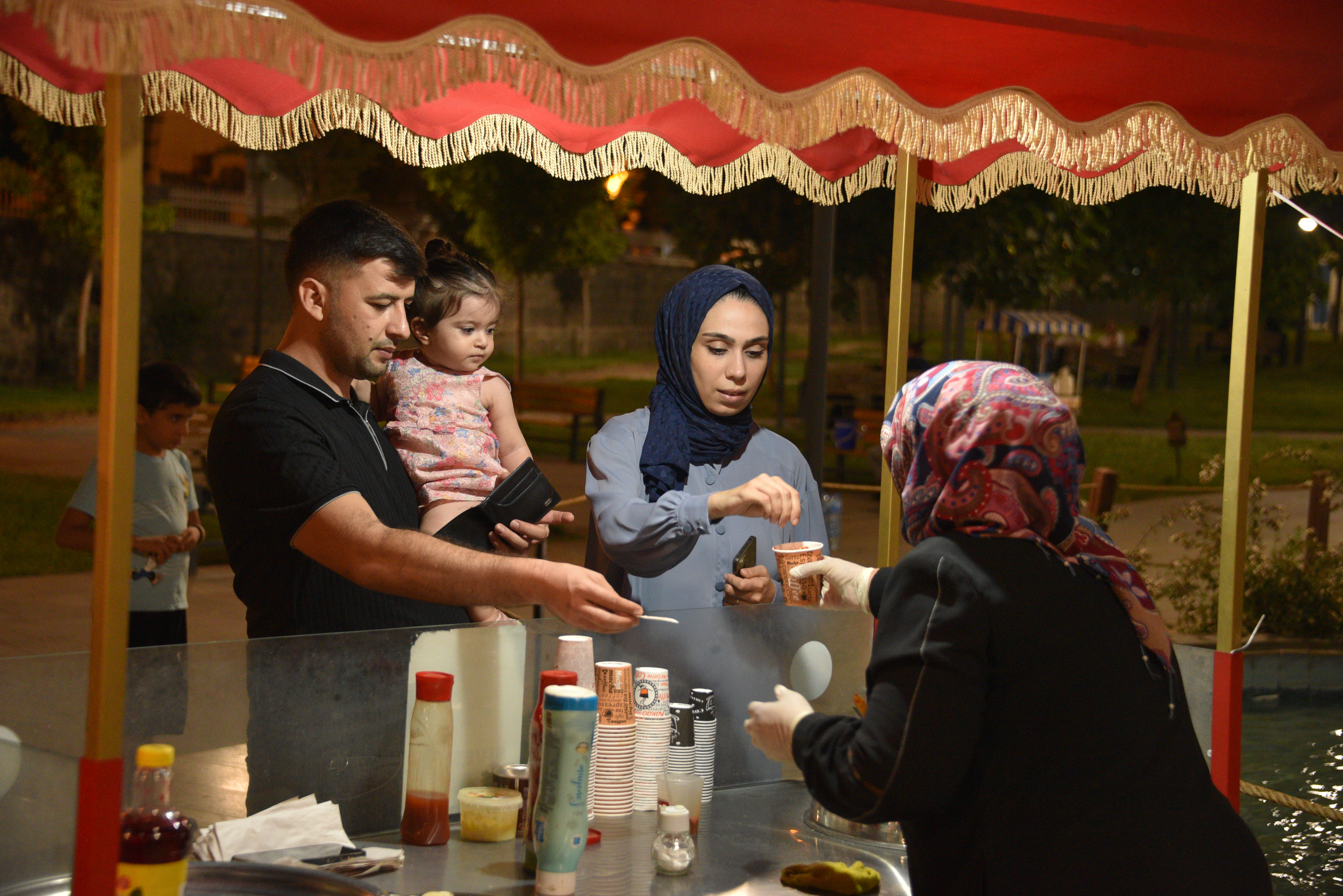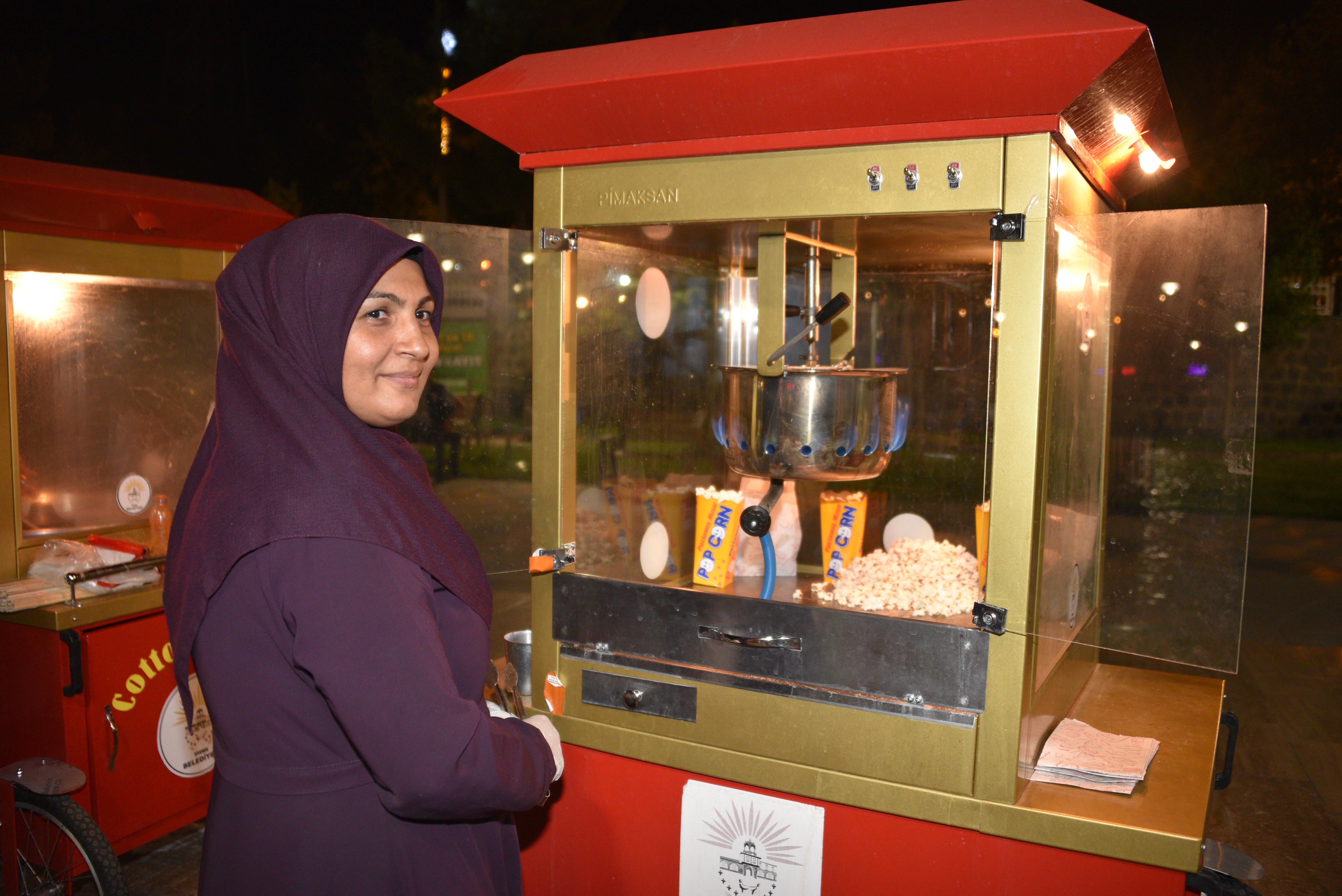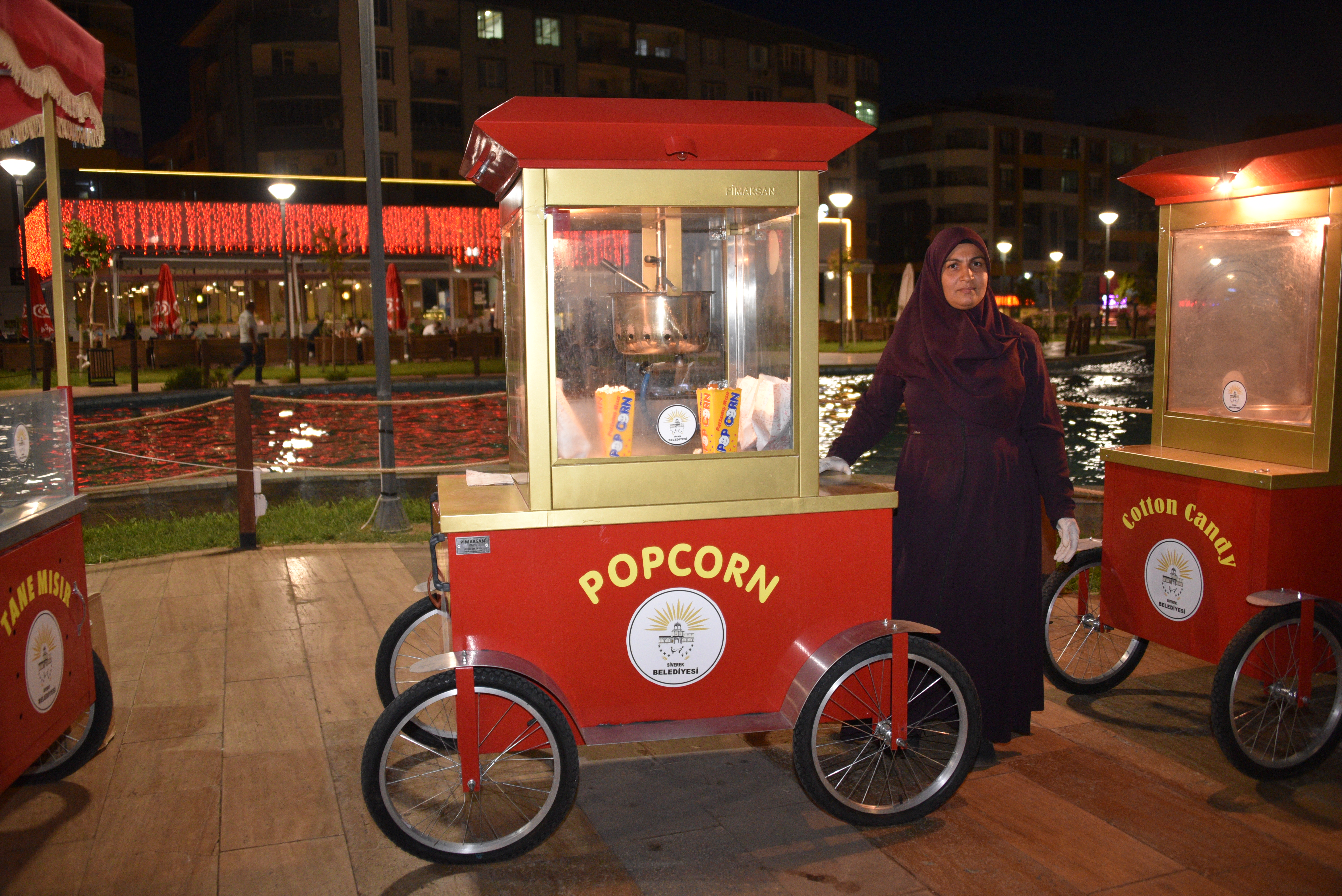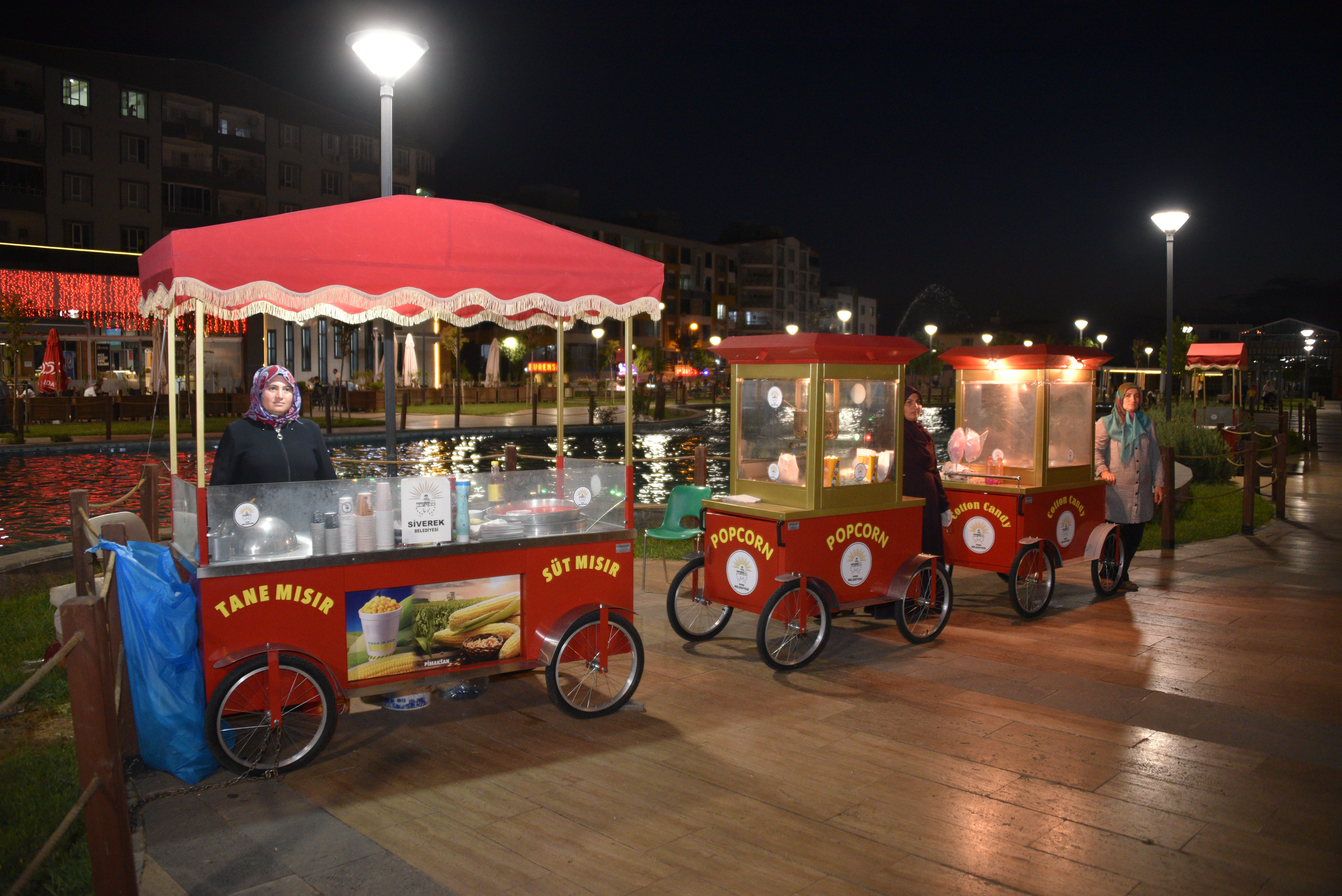 Bu kadınlar, akşam saatlerinde ziyaretçi akınına uğrayan parkta belediye tarafından tahsis edilen araçlarda süt mısır, patlamış mısır, pamuk şeker ve cici bici gibi ürünler satıyor.