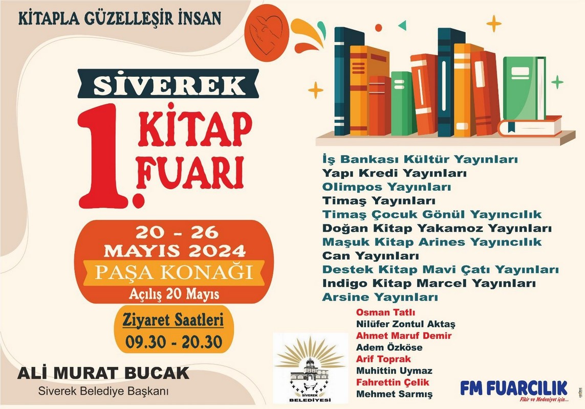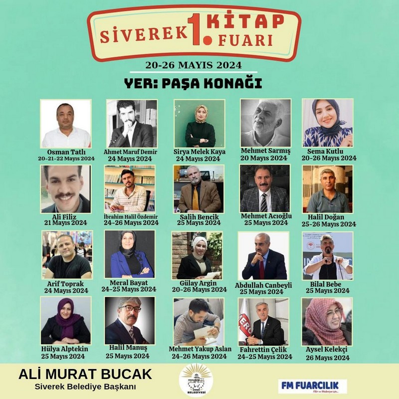 Basın Yayın ve Halkla İlişkiler Müdürlüğünden yapılan açıklamada, “Belediyemizin ev sahipliğinde düzenlenen Siverek 1. Kitap Fuarı 20-26 Mayıs tarihleri arasında 09.30-20.30 saatleri arasında ziyaret edilebilecek. Tarihi Paşa Konağı'nda düzenlediğimiz fuar, birbirinden değerli yayınevlerini bir araya getiriyor. Kitapseverlerin buluşma noktası olan fuarı kaçırmayın. Kitaplarla buluşmanın keyfiyle dolu bir hafta geçireceğimiz bu fuarla, okuma alışkanlığını artırmayı hedefliyoruz. Tüm kitapseverleri fuarımıza davet ediyoruz.” ifadeleri kullanıldı.