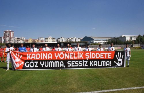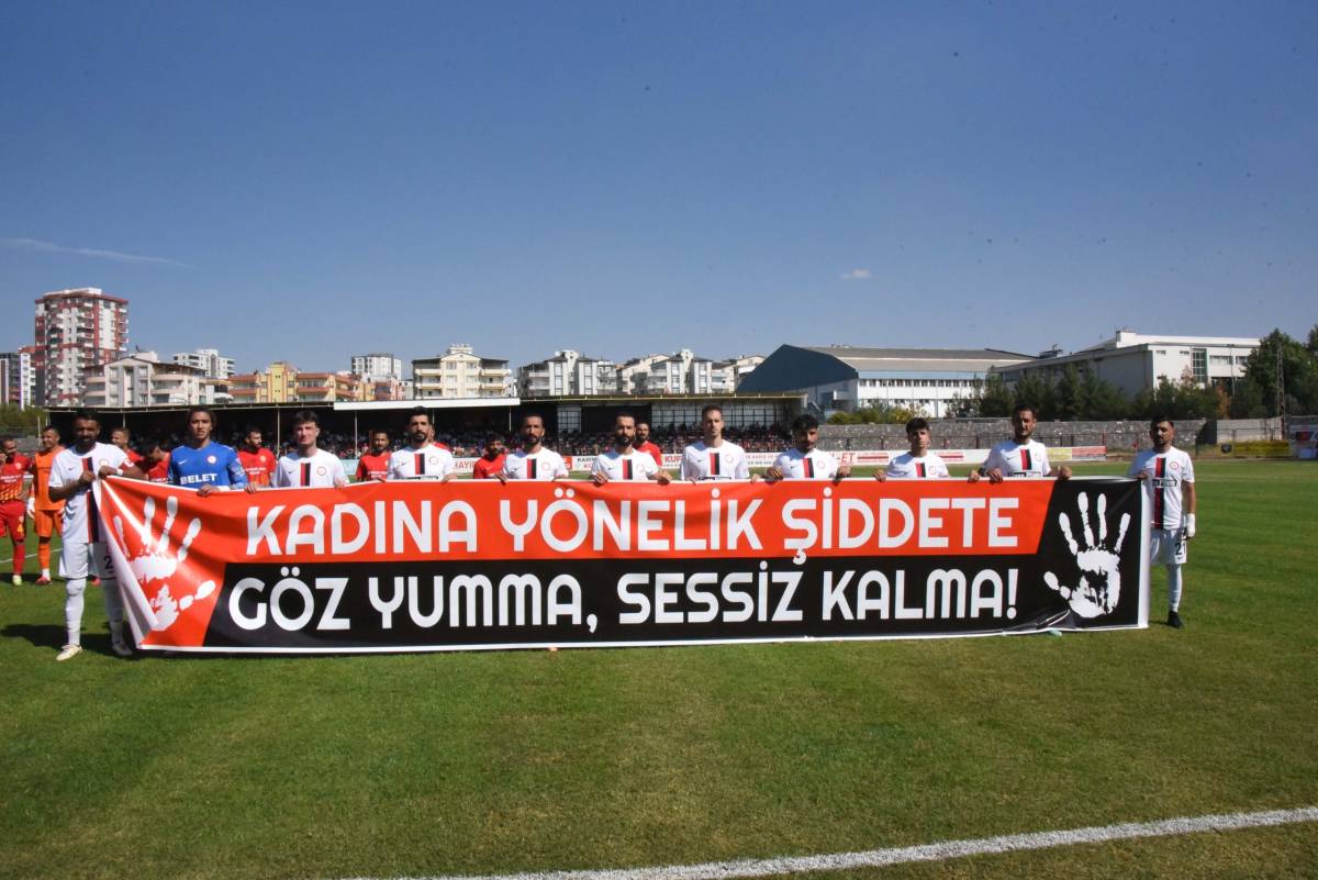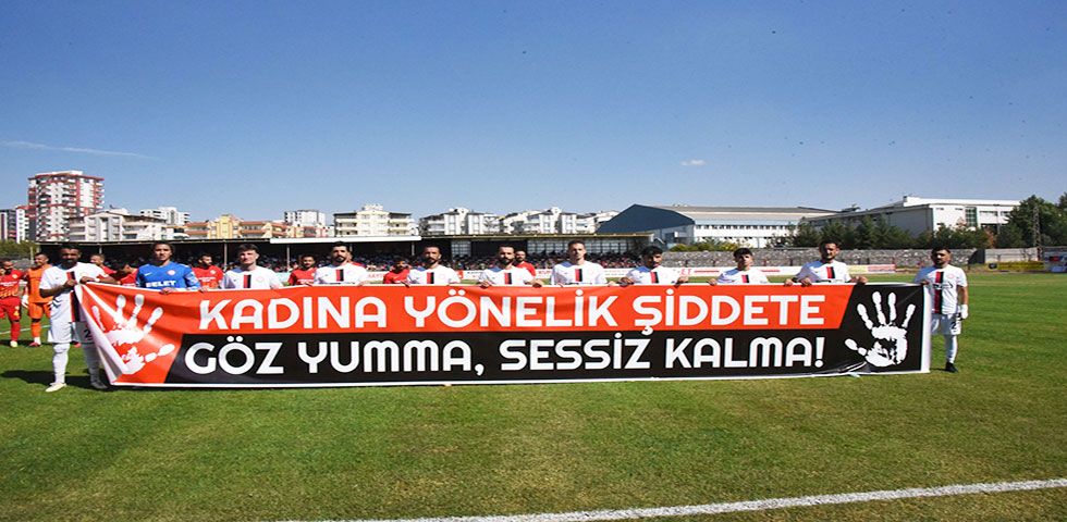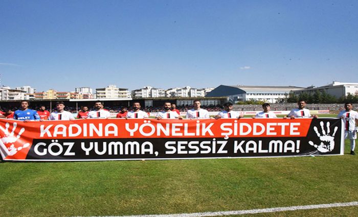 Siverek Firkan Tüysüz şehir stadında saat 13:00 te başlayan karşılaşmada Siverek Belediyespor futbolcuları “kadına yönelik şiddete, göz yumma sessiz kalma” pankartı ile sahaya çıkması dikkat çekti.